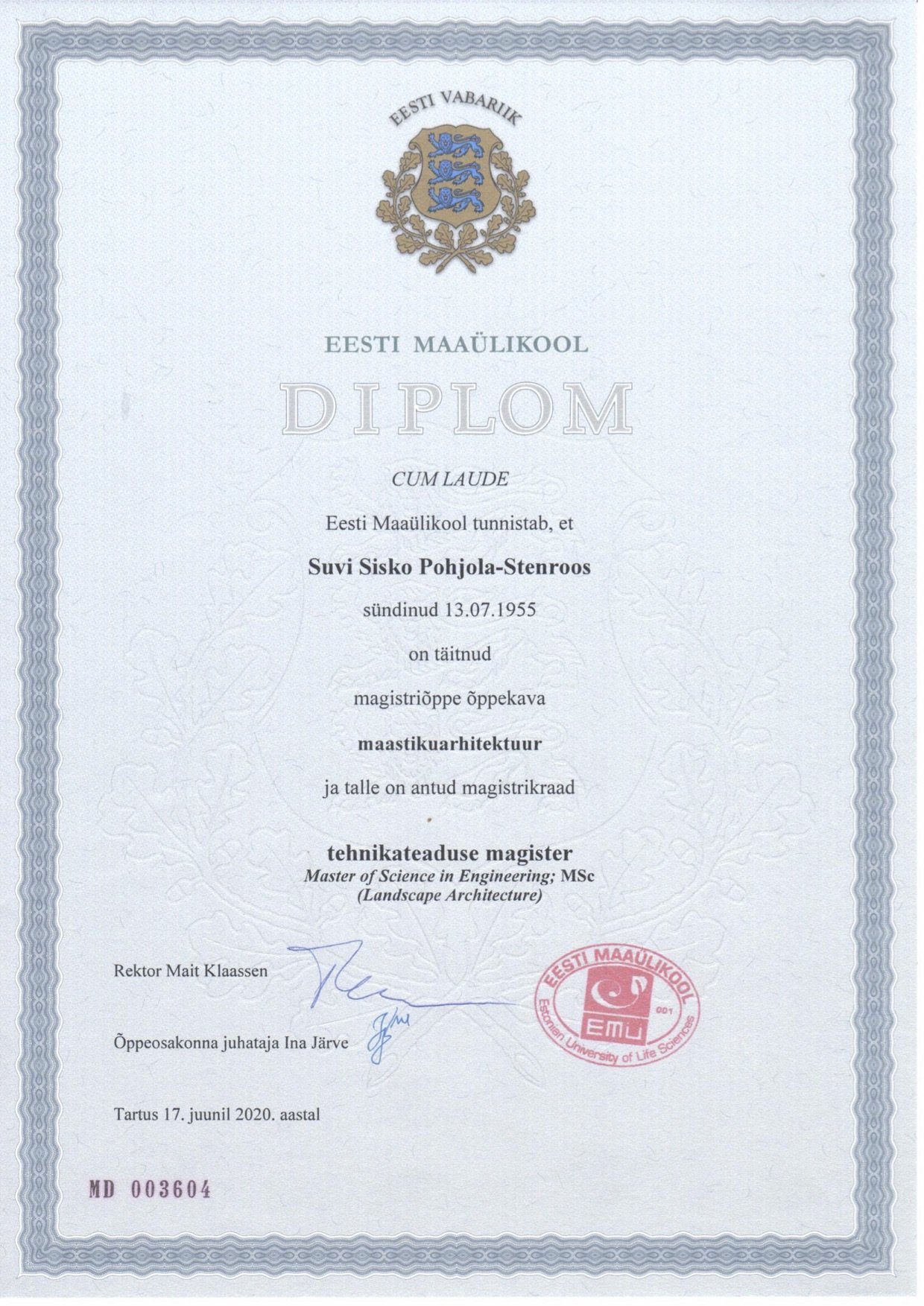 yo 1975, ELL 1982, ELT 1986, hyg.tutk. 1987, DABVPF (emer) 2006, yMBA 2008, maisema-arkkitehti 2020